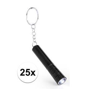 25x Sleutelhangers met LED zaklampje zwart. Mini zaklampje voor aan een sleutelbos. Lengte: 6,5 cm. Diameter: 1,4 cm. Deze zaklamp werkt op knoopcel batterijen, deze zijn inbegrepen.